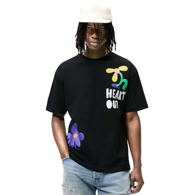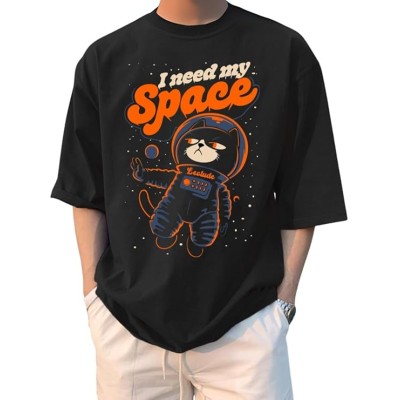 Half Sleeve Oversized Tshirt for Men, Round Neck Cottonblend Drop Shoulder Printed T-Shirt (Black Color)