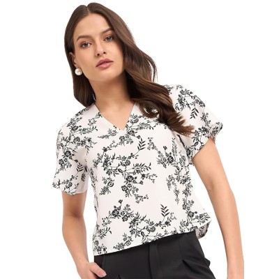 Printed Top with Contrast Tipping – Stylish Ethnic & Western Tops for Women – Summer Travel Wear, Trendy Tops for Jeans, Lightweight & Comfortable Casual Wear