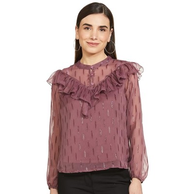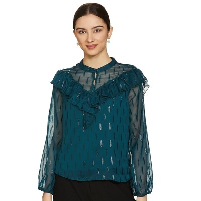 Women Polyester Textured Full Sleeves Ruffled Casual Regular Fit Top
