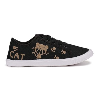 Women's Cat Print Canvas Sneakers, Black with Gold Design, Low Top, Casual